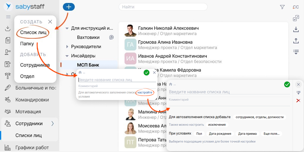Создавайте любые списки — например, по должности, возрасту или отделу. Просто задайте условия, Saby запомнит их и будет проверять, кто из сотрудников под них подходит. При необходимости вы всегда сможете отредактировать списки вручную.