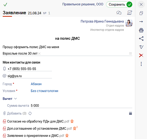 Добавили удобные шаблоны заявлений по ДМС. Сотрудник получает форму с подходящей для его категории программой и заполняет контакты.