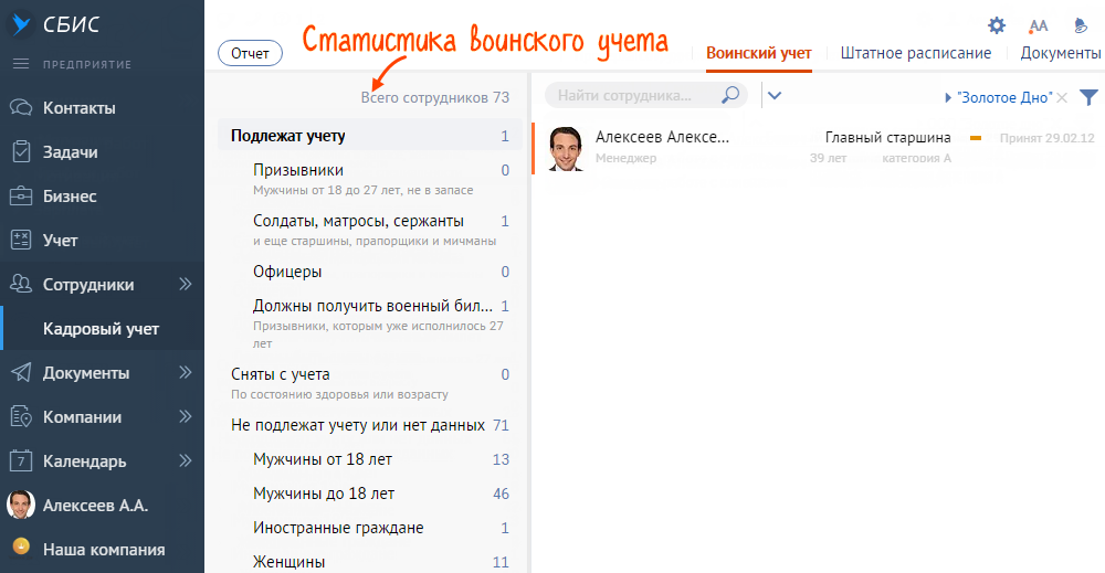 Воинский учет — весомая нагрузка для отдела кадров, и чем крупнее организация, тем сложнее его вести. Поможет СБИС: сдавать отчеты в военкомат, оповещать сотрудников и поддерживать актуальность сведений о военнообязанных будет проще.