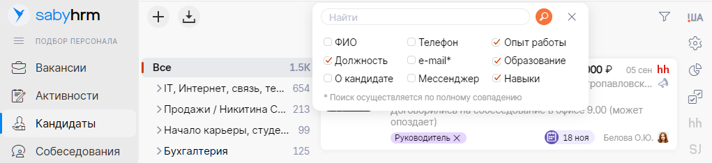 Удобно, когда нужно быстро найти кандидатов по основным параметрам в имеющейся базе. Добавили новые критерии: должность, опыт работы, образование и навыки. Отметьте нужные условия, введите запрос в строке поиска — можно сразу несколько через запятую. Система подберет релевантных специалистов, например менеджеров с опытом активных продаж и привлечения клиентов.
