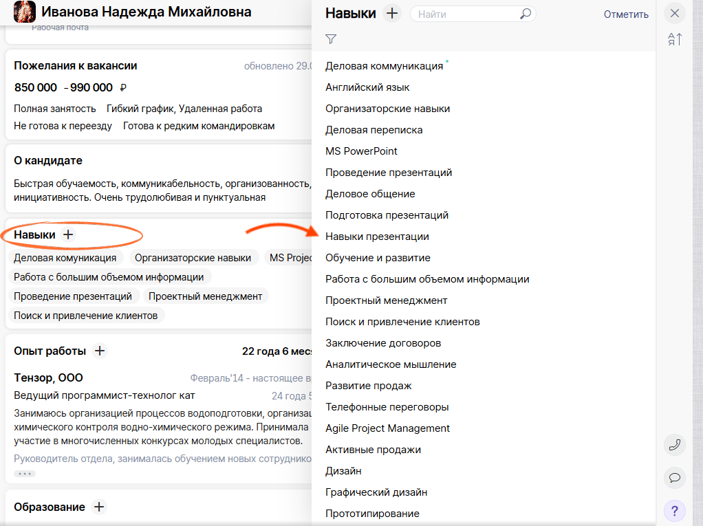Единый справочник наполняется автоматически при загрузке данных с работного сайта — больше не нужно вручную использовать теги или дополнительные поля. Теперь в карточке кандидата можно быстро отметить soft и hard skills. Также самостоятельно добавляйте навыки, которые специалист не указал в анкете, но озвучил на собеседовании. Отмечайте компетенции соискателя прямо из резюме и оперативно принимайте решение.