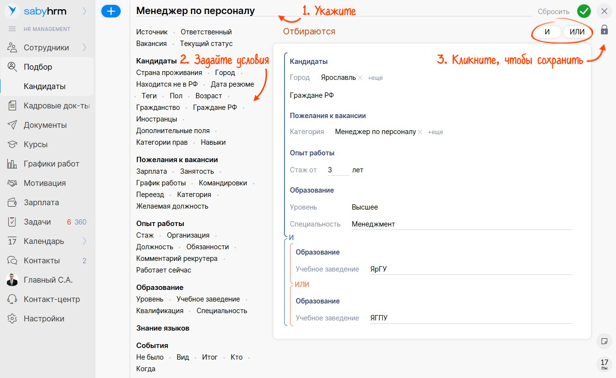 Пригодятся, если вы регулярно ищете кандидатов по одинаковым сложным критериям. Настройте фильтр один раз — например, выберите соискателей из категории «Менеджер по персоналу» из Ярославля, со стажем от 3 лет, с высшим образованием, но из двух конкретных вузов. Система будет автоматически обновлять выборку при появлении новых совпадений. Создавайте неограниченное число подборок под нужные параметры, добавляйте готовый список специалистов сразу в вакансию или выгружайте в файл — это экономит время и упрощает работу с базой.