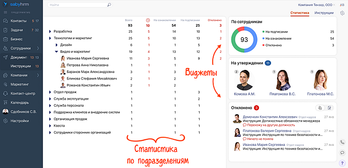 Используйте обновленную вкладку «Статистика» и вспомогательные виджеты в разделе «Инструкции»: просматривайте, кто не согласовал или не подписал инструкции, и напомните сделать это как можно скорее. Вся информация — в одном окне.