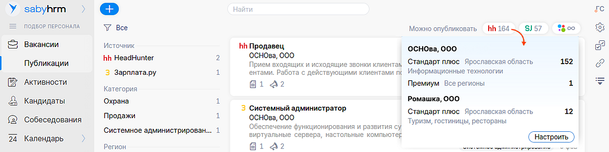 Иногда нужно быстро разместить вакансию, а у вас неожиданно закончился тарифный пакет или прервалось соединение с рекрутинговым сервисом. Теперь вам не придется тратить время на лишние проверки и переключаться между вкладками — вся важная информация по интеграциям отображается прямо в Saby.
