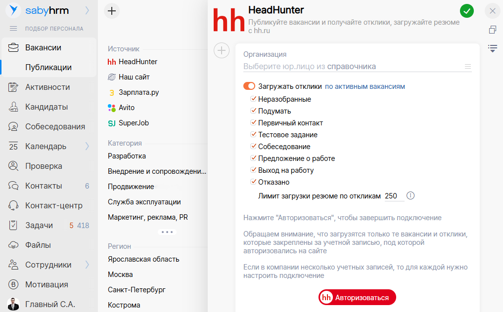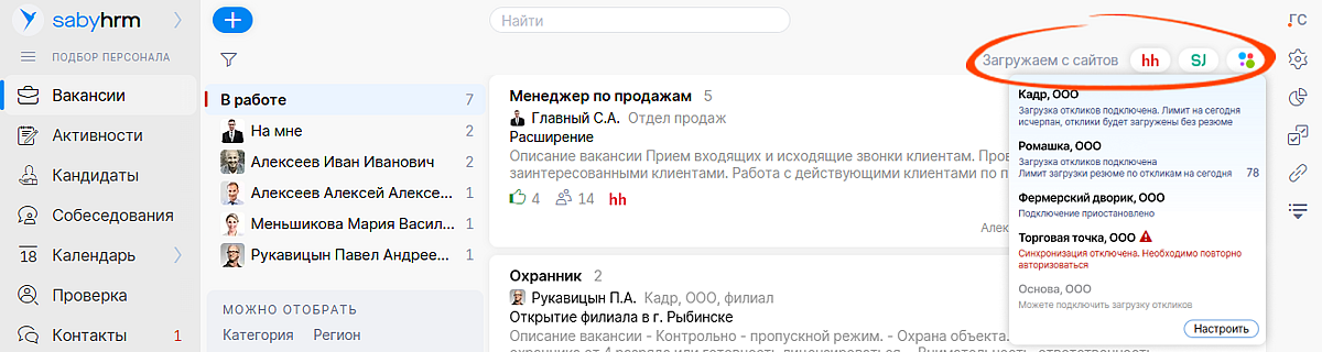 Вам больше не нужно проверять каждое подключение вручную — все статусы видны на одном экране. В разделах «Вакансии», «Публикации» и «Отклики» при наведении на логотип сразу видно, для каких сайтов настроено соединение. В случае ошибки появится предупреждение, а если сайты еще не настроены, Saby предложит их подключить.
