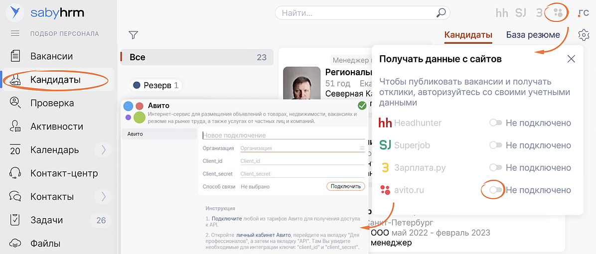 Saby автоматически создаст карточку кандидата с помощью плагина Saby HR на панели инструментов вашего браузера. Перенести данные с помощью расширения можно не только с «Авито», но и с HeadHunter, Superjob, «Зарплата.ру», LinkedIn, «Хабр Карьера», «Работа.ру», «Работа России» и «Вакансии Юла». Если вы еще не подключили сервис по автоматизации рекрутинга от Saby, оставьте заявку по кнопке ниже. С вами свяжется менеджер, подробно расскажет про возможности сервиса и ответит на вопросы.