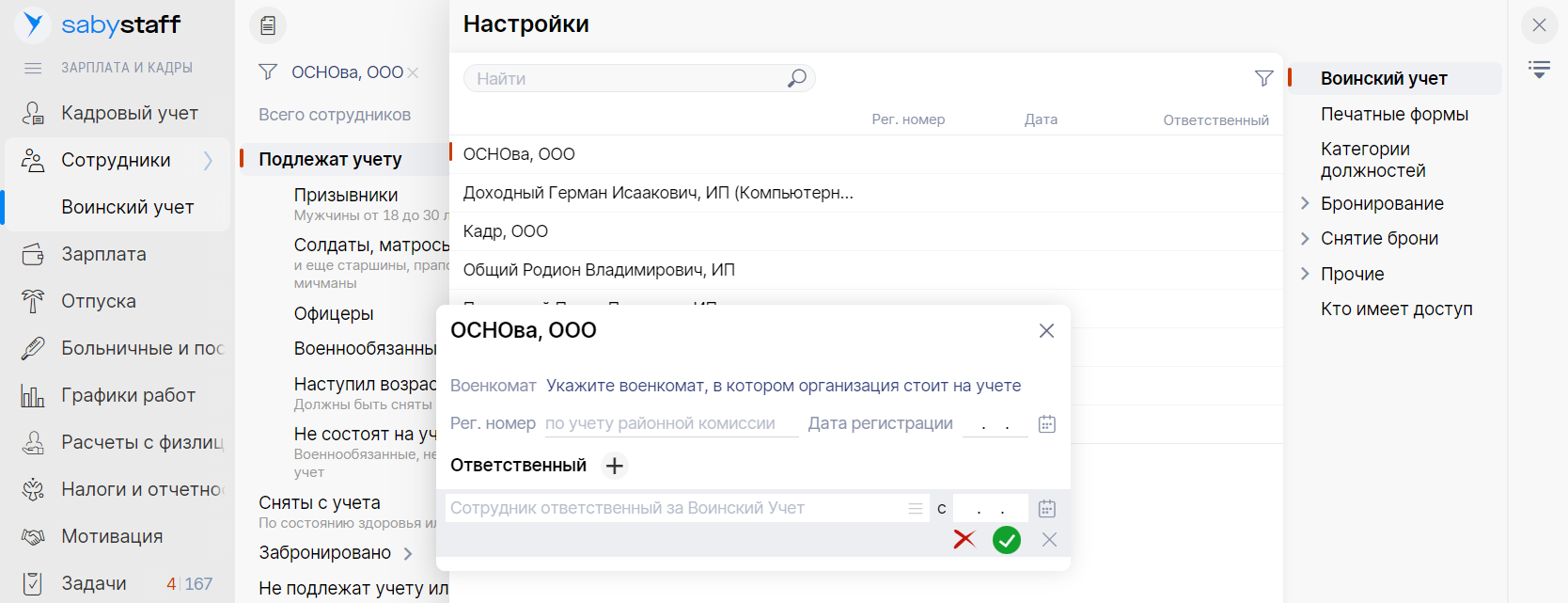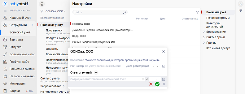В чек-лист кадровых документов (прием/увольнение) добавили блок для воинского учета.При приеме укажите, что сотрудник военнообязанный. Saby (СБИС) предложит заполнить о нем сведения и отправить извещение в военкомат.