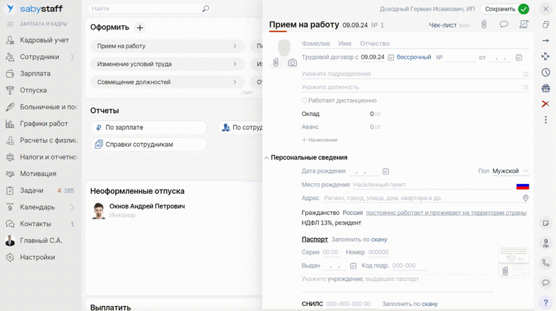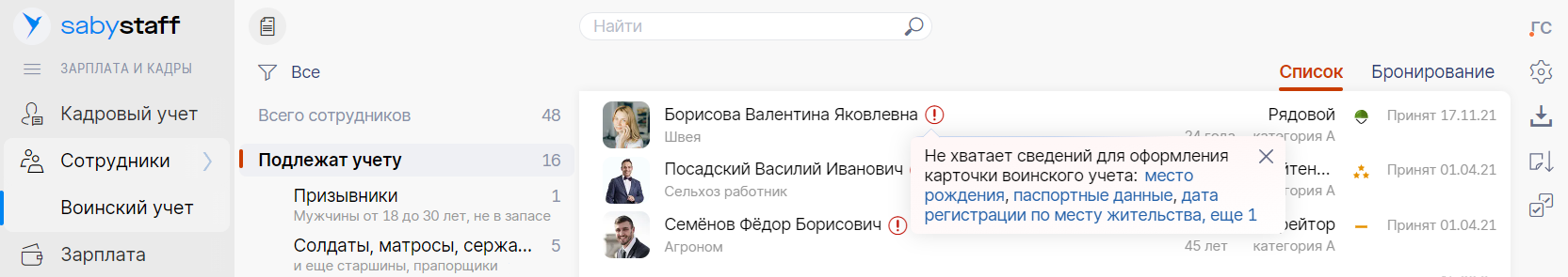 Расширили информацию о сотрудниках. Saby сообщит, каких сведений не хватает для заполнения отчетов. Например, даты регистрации по месту жительства, профессии, даты снятия с воинского учета.
