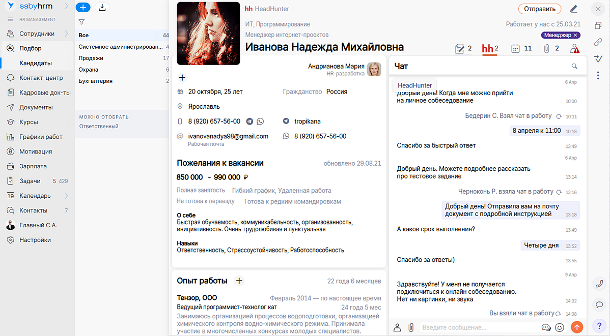 Попасть в диалог легко, кликнув на логотип работного портала HeadHunter, «Зарплата.ру» или «Работа.ру» в карточке кандидата. Все устроено так же, как и переписка в мессенджерах через Saby.