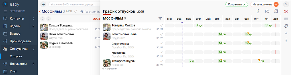 Раздельные графики, управление должностями и тиражируемые печатные формы — все, чтобы сделать планирование отпусков проще и эффективнее.