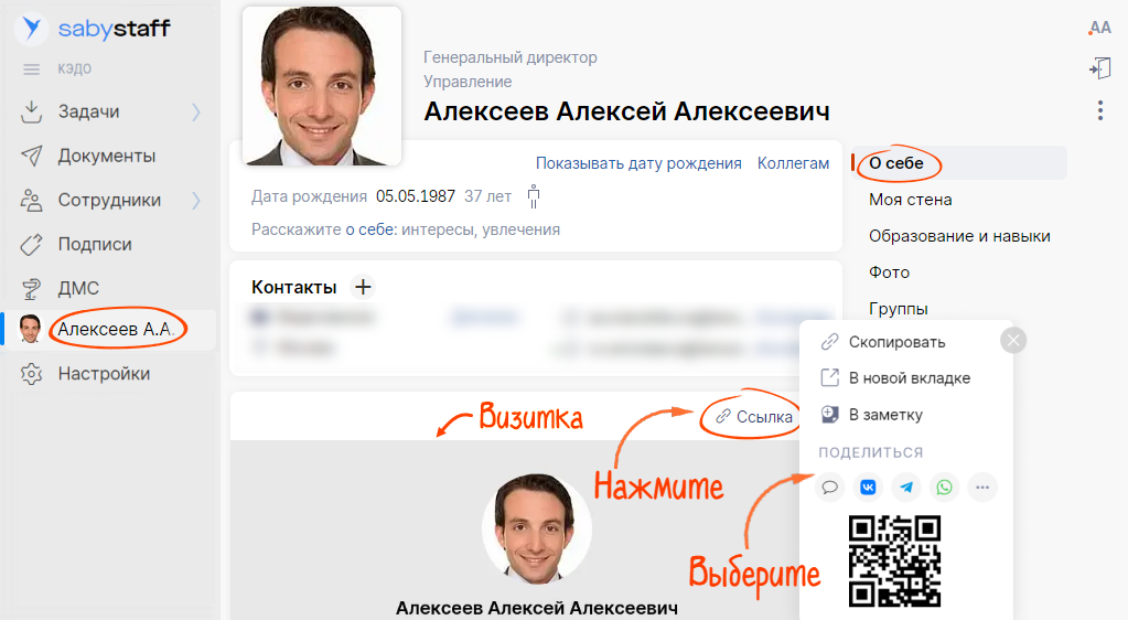 Перейдите в ваш профиль и отправьте визитку в мессенджеры прямо из Saby или просто скопируйте ссылку. Можно разместить ее на корпоративных страницах и в личных блогах. А если нужно дать QR-код (например, на распечатанном объявлении), забирайте его из визитки.