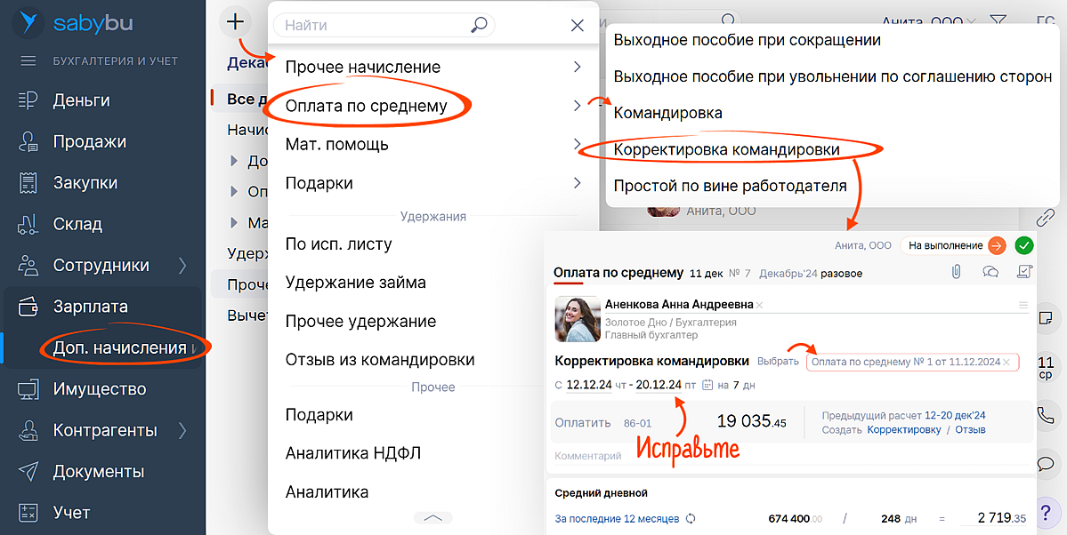 Создание из раздела «Зарплата» корректировочных документов: «Оплата по среднему отзыва из командировки» и «Оплата по среднему корректировки командировки». Выберите изначальную оплату по среднему по этой командировке — Saby скорректирует ее автоматически.