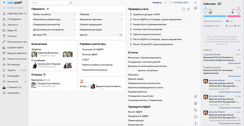 В Saby Staff только те разделы, которыми бухгалтер по зарплате или кадровик пользуется чаще всего. Мы уже добавили на рабочий стол все самое важное, но вы легко можете изменить его под себя с помощью виджетов.