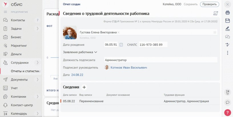В СБИС появилась возможность выдавать СТД-Р в разделе «Справки сотрудникам». Документ заполняется автоматически по данным кадрового учета, но вручную можно внести дополнительные сведения: