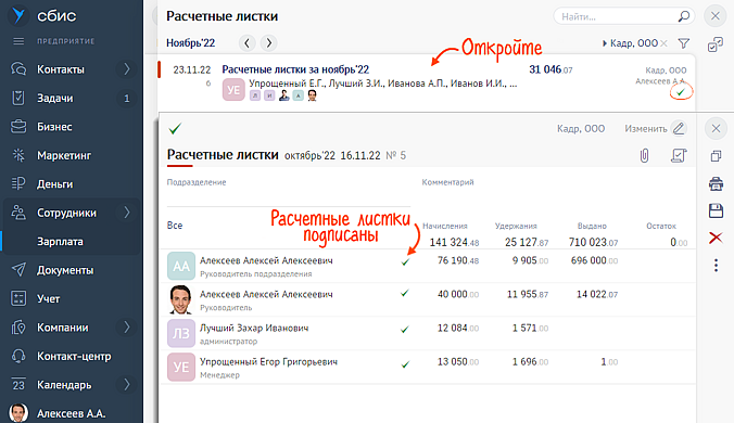 Сотрудники смогут в любой момент увидеть свои начисления, удержания, премии, отпускные и другие выплаты.