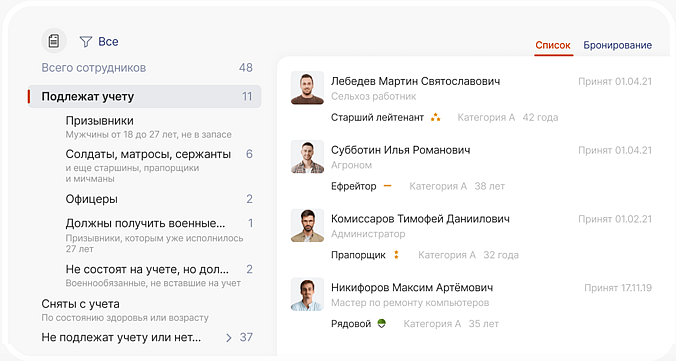 Контролируйте статистику и выгружайте списки по категориям военнообязанных. Все данные сотрудников — на одной странице и всегда под рукой.