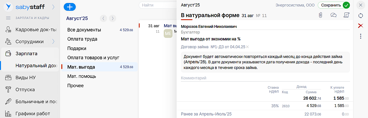 Матвыгода — это неденежный доход от экономии на процентах по займу, поэтому мы перенесли ее в раздел «Натуральный доход». Все работает в соответствии с законом: датой получения дохода Saby считает последний день месяца и удерживает налог в ближайшие денежные выплаты (не более 50%). А остаток неудержанного налога покажет в отчетности за год.