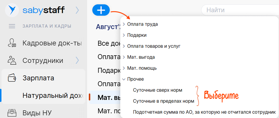 Кроме материальной выгоды от займов, в разделе «Натуральный доход» отражаются: часть зарплаты в натуральной форме, оплата товаров и услуг за сотрудника (спорт, обучение, отдых), подарки и матпомощь. Сюда же переехали суточные — в пределах нормы и сверх нее. Вся информация по неденежным доходам находится рядом.