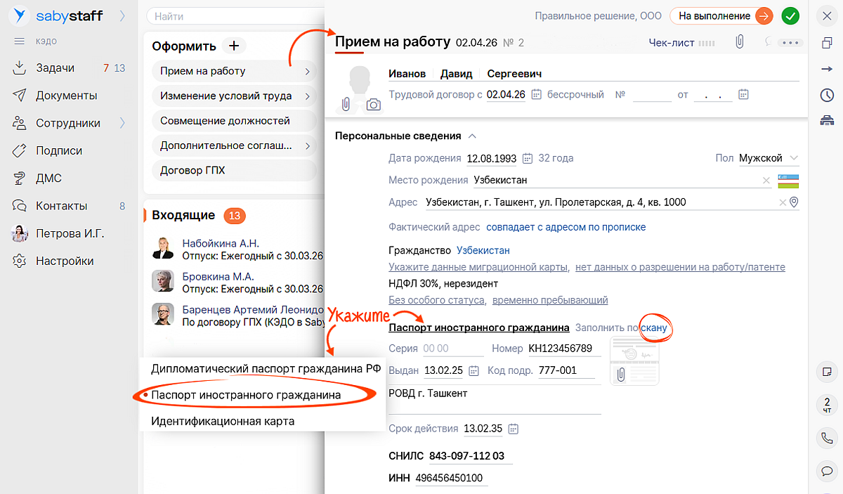 Больше не придется вручную переносить в систему информацию из паспорта иностранного гражданина СНГ и его ВНЖ. Теперь на это уйдет всего несколько минут — Saby сам распознает документы. Загружайте скан прямо в его карточку при оформлении трудоустройства или обновлении сведений.