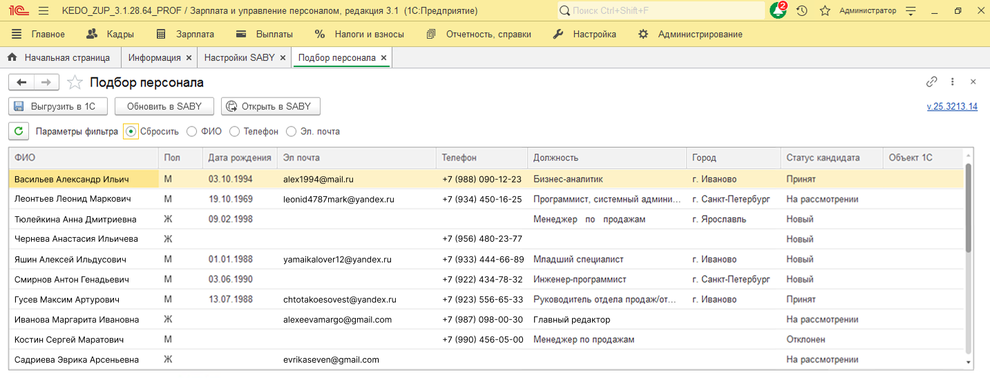 Статусы по отправленным анкетам отразятся на странице «Подбор персонала» в интерфейсе 1С. Когда соискатель пришлет документы в Saby, вы легко перенесете их в свою учетную систему.