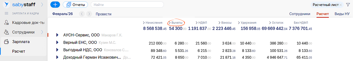 Контролировать общую картину по вычетам всех ваших организаций стало удобнее. В новой колонке «Вычеты» раздела «Зарплата/Расчет» покажем все примененные вычеты по вашим сотрудникам в одном окне. Колонка не появится, если вычеты не предоставлялись.