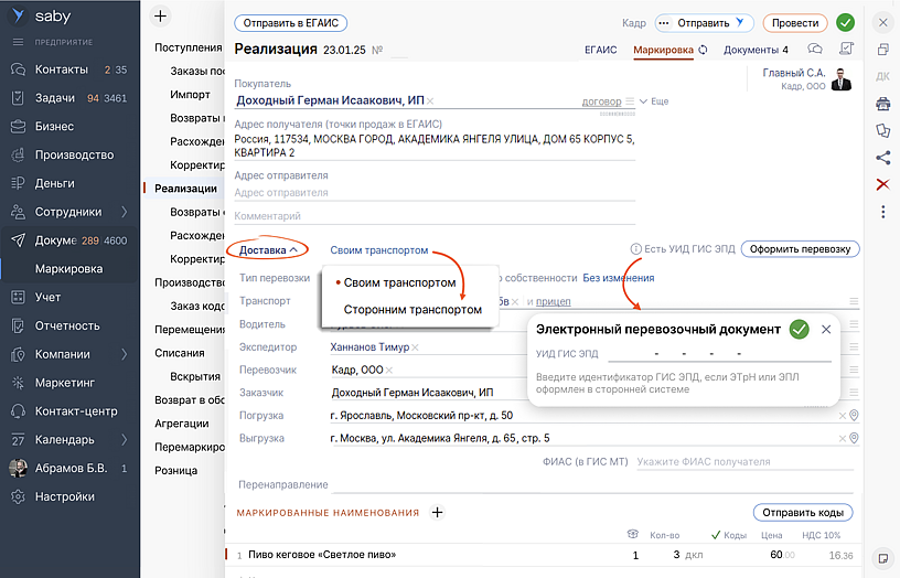 В УПД, помимо товарного раздела, есть блок для заполнения информации по доставке: данные автомобиля, водителя, экспедитора. Если ЭТрН создана через Saby TMS, она подтянется в УПД. Вам останется только проверить заполнение и нажать «Оформить перевозку» — данные автоматически уйдут в Минтранс.