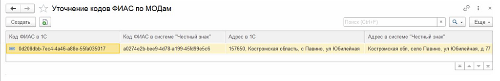 Задайте ФИАС ID вручную в блоке «Уточнение кодов ФИАС по МОД». Укажите полный адрес доставки и сам ID (возьмите в ФНС или запросите у покупателя — он видит свой МОД в «Честном знаке»).