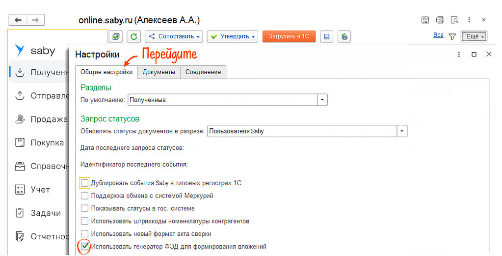 Подробнее о настройке интеграции между Saby и 1С — в базе знаний.