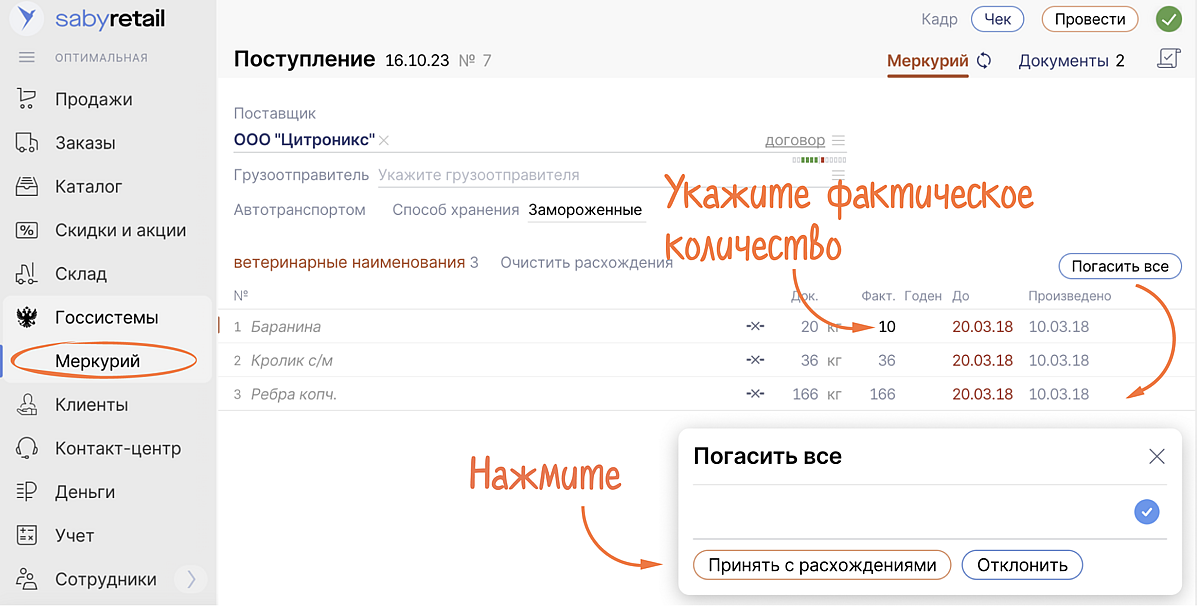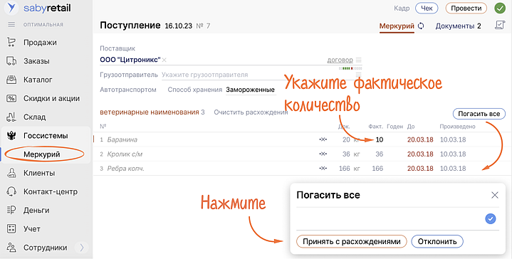 Теперь решить этот вопрос быстрее и удобнее: СБИС сформирует акт о расхождениях прямо в документе поступления и отправит его поставщику. Вы сократите время на приемку маркированных и «меркурианских» товаров и сможете реализовать скоропортящуюся продукцию, не дожидаясь исправления документов.