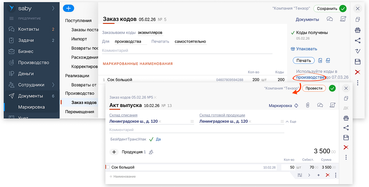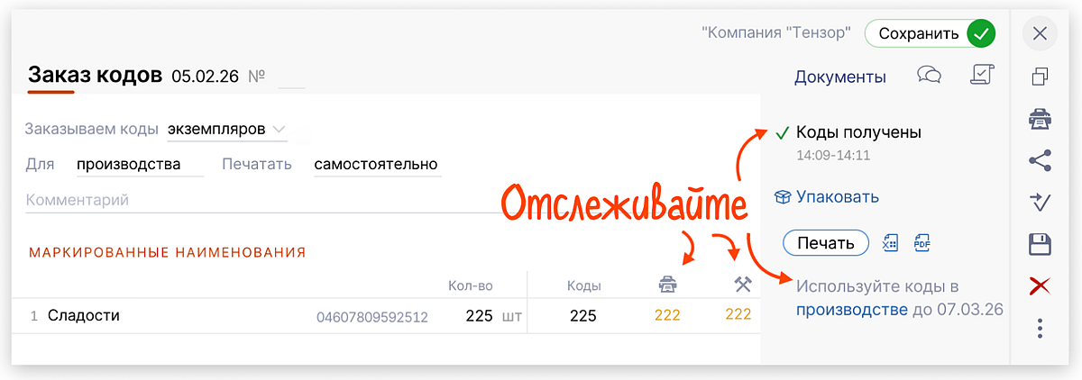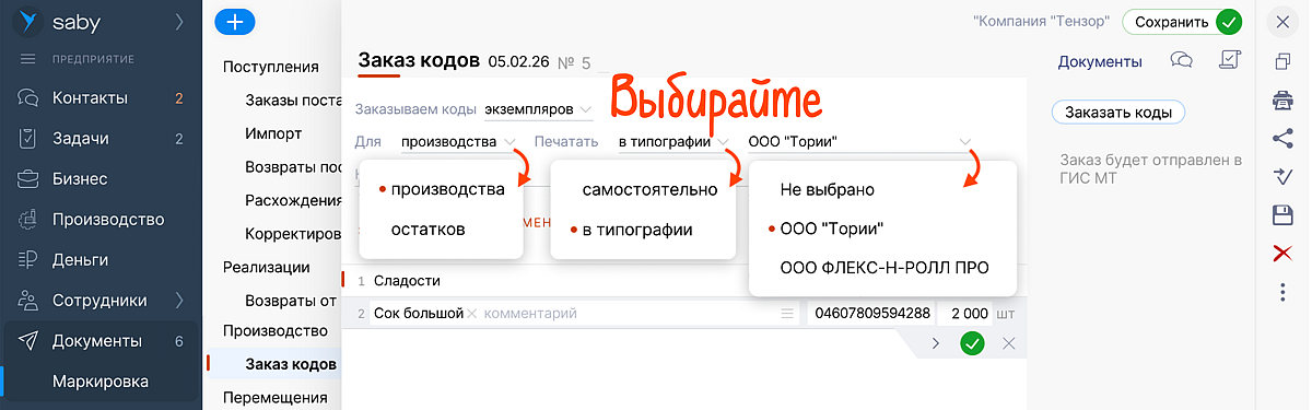 Техработы или сбои в «Честном знаке» могут затянуть получение этикеток. Чтобы не останавливать выпуск, госсистема рекомендует держать резерв кодов минимум на 7 дней. В Saby уже есть готовый сценарий: вы заказываете коды заранее, а используете их постепенно — и не зависите от доступности ГИС МТ. Работать с маркировкой впрок удобно через «Заказ кодов». Вы выбираете продукцию и количество кодов под плановый выпуск. Определяете способ печати — на своем оборудовании или в типографии. Когда ГИС МТ выпустит коды, они появятся в том же заказе и станут доступны для печати и внесения в документ выпуска.