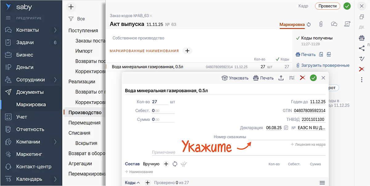 С 11 ноября 2025 года «Честный знак» проверяет номера скважин и реквизиты лицензии на добычу для упакованной питьевой, минеральной и детской воды. Требование касается производителей: в актах выпуска с типами «Собственное производство» и «Контрактное производство» эти данные должны быть заполнены. Если вода добывается из подземных источников, внесите номер скважины и реквизиты лицензии в акт выпуска в Saby. Без этих данных документ ввода в оборот не пройдет обработку.