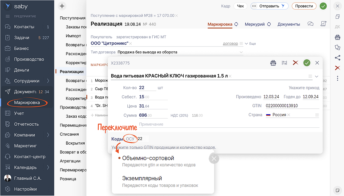 Поставщик может отправить товар и в поэкземплярном, и в объемно-сортовом формате. В исходящем документе нужно кликнуть на переключатель вида учета и выбрать нужный или сразу отсканировать коды маркировки.