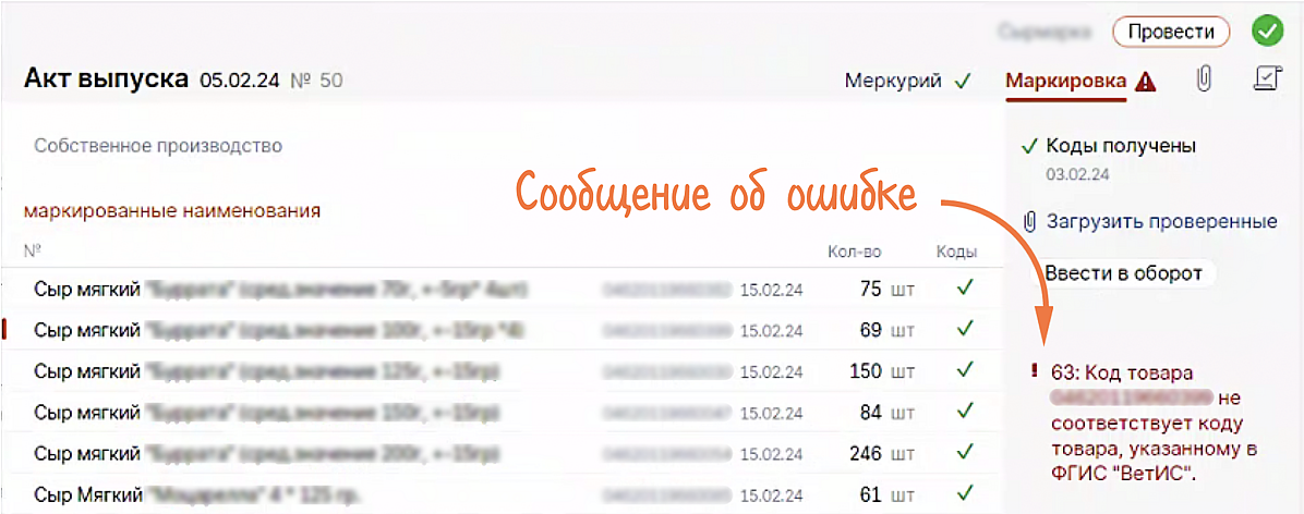 Честный знак отправил участникам оборота информацию о проверке на соответствие GTIN сведениям из ВСД для товарной группы «Молочная продукция». Если при вводе в оборот данные о GTIN в Честном знаке и «Меркурии» разойдутся, документ будет обработан с ошибкой.