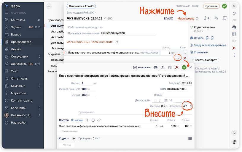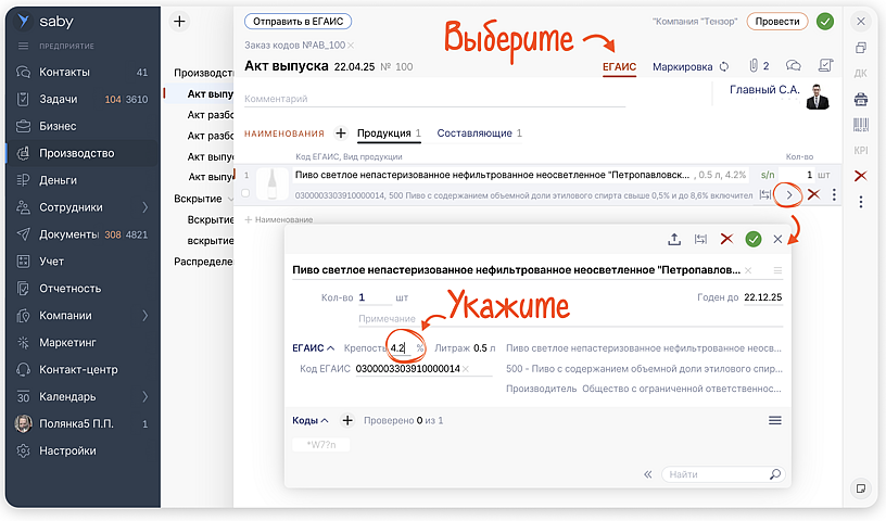 В Saby уже все готово — никаких дополнительных настроек не требуется. Просто укажите фактическую крепость при оформлении акта выпуска: