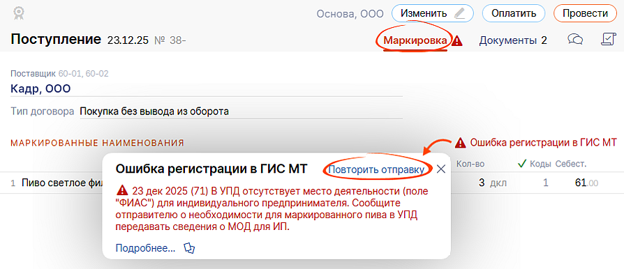23 декабря часть пользователей при отправке документов реализации и поступления получила ошибку с кодом 71: