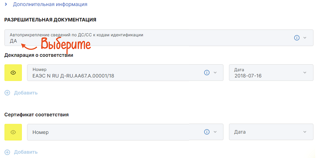 Сразу внесите в карточку Нацкаталога сведения документах, подтверждающих соотвествие: номер и срок действия декларации/сертификата.