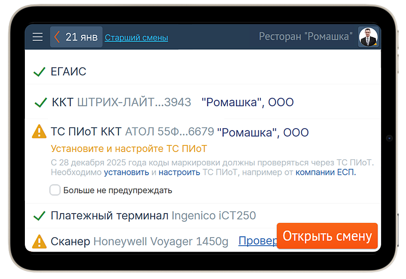 Интегрировали в Saby модуль ТС ПИоТ от АО «Единая сервисная платформа» (ЕСП). С 28 декабря 2025 года проверка маркировки на кассе должна выполняться через ТС ПИоТ — специализированное ПО, работающее в связке с ККТ и «Честным знаком». В Saby Retail уже интегрирован ТС ПИоТ от аккредитованного разработчика АО «ЕСП». Розничным продавцам осталось обновить прошивку ККТ, настроить модуль — и продолжить продажи без изменений сценария. Если вашей модели кассы или совместимого ПО пока нет в реестре «Честного знака», обновиться можно по мере появления прошивок — сейчас работу с маркировкой через ТС ПИоТ не проверяют.