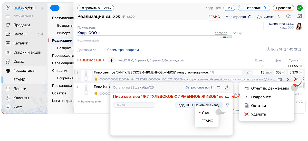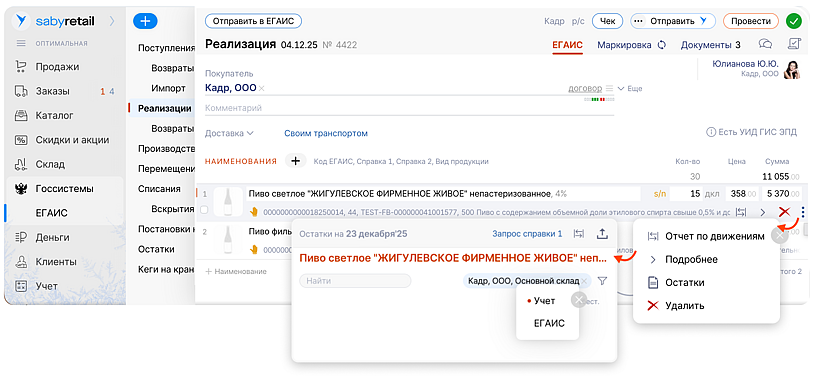 С 21 декабря ЕГАИС из‑за повышенной нагрузки реже отвечает на запросы по остаткам — сейчас ответ приходит не чаще одного раза в 48 часов. Saby работает без сбоев и обновляет данные как обычно.