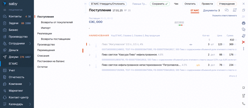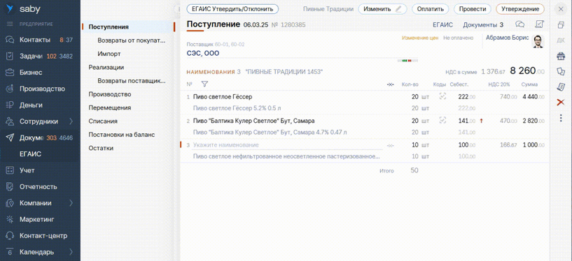 Входящие поступления алкоголя, полученные по ЭДО и через ЕГАИС, теперь будут объединяться в один документ, если в них совпали реквизиты отправителя и получателя, дата и номер. Порядок получения неважен, главное — первый не должен быть проведен до получения второго документа. Утверждать их можно отдельно и вместе.