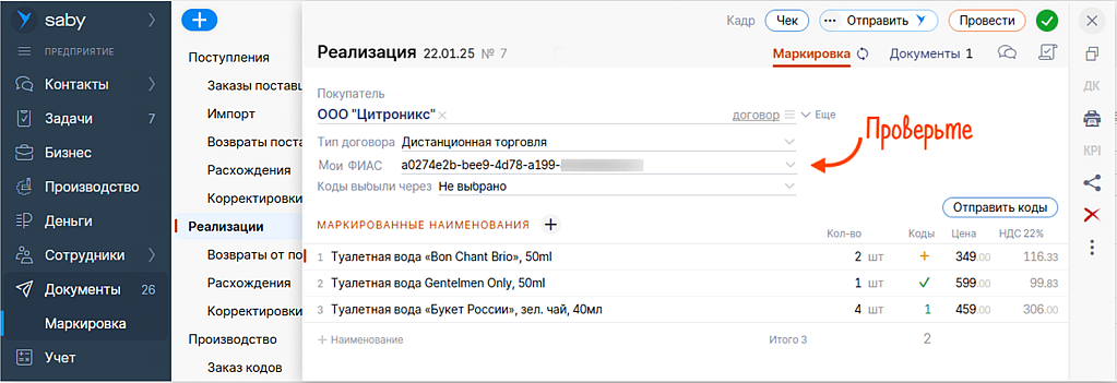 Saby при проведении документов будет проверять заполнение поля «Мой ФИАС». Проследите, что данные актуальны и внесены корректно.