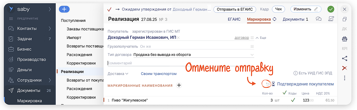 Позволит сканировать и проверять коды на смартфоне или ТСД без привязки к рабочему столу с компьютером — в мобильном приложении Saby Docs. Даст возможность отменить фиксацию кодов — остановить передачу одним нажатием или аннулировать документ.
