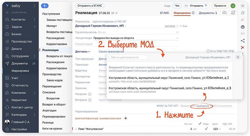 Заполнит ФИАС ID по адресу при отгрузке и перемещении.