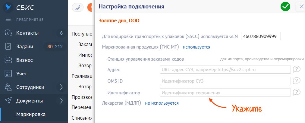 В разделе «Маркировка» зайдите в «Настройки» и введите скопированное значение в поле идентификатор. Подробнее в инструкции.