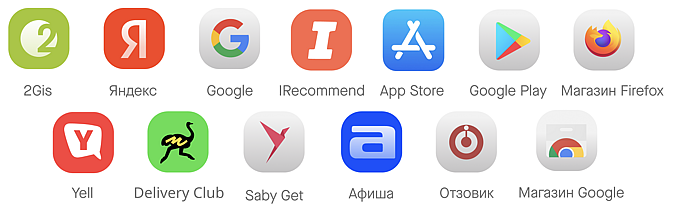 Saby соберет за вас отзывы с 13 популярных площадок: Saby Get, Google, 2ГИС и Яндекса, Delivery Club, IRecommend, Yell, ZOON, Афиши, Отзовика, AppStore, Google Play, Магазин Chrome, Магазин FireFox.