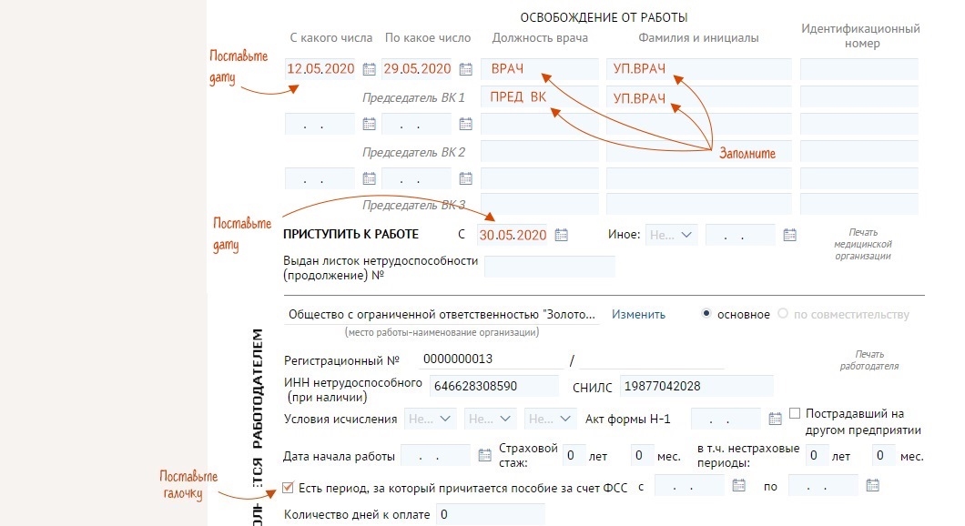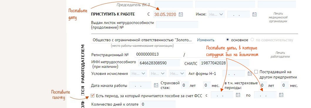 Например, сотрудник 65+ отработал с 12 по 19 мая включительно. Работодателю нужно проставить даты самого больничного — с 12 по 29 мая, а в поле «Есть период, за который причитается пособие за счет ФСС» указать период, который сотрудник не работал по факту, — в нашем примере это с 20 по 29 мая.