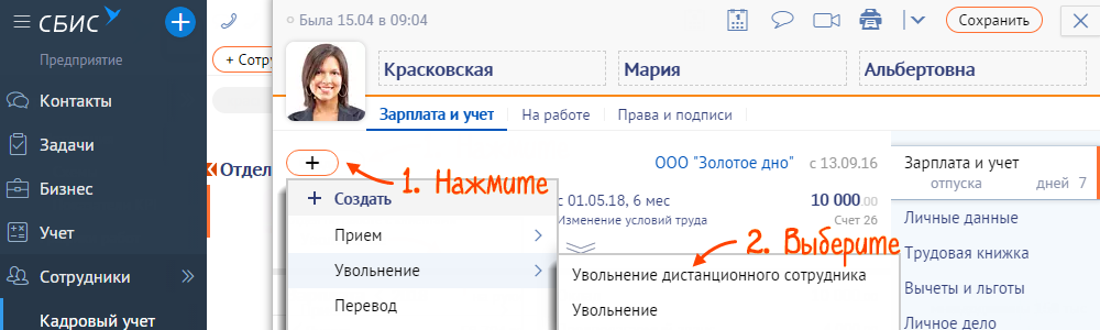 Подключите пакет «Работа с дистанционным сотрудником» в маркете компонентов. В нем собраны шаблоны всех необходимых кадровых документов и настроены маршруты их прохождения. Создавайте документы приема, перевода, увольнения в разделе «Кадровый учет» или из карточки сотрудника. СБИС сам сформирует заявления, приказы, договоры и отправит их на согласование. Сотрудник подпишет документы электронной подписью — лично приезжать в офис не нужно.