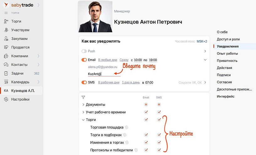 Подробнее о том, как настроить информирование для себя, коллеги или компании — уведомления для торгов.