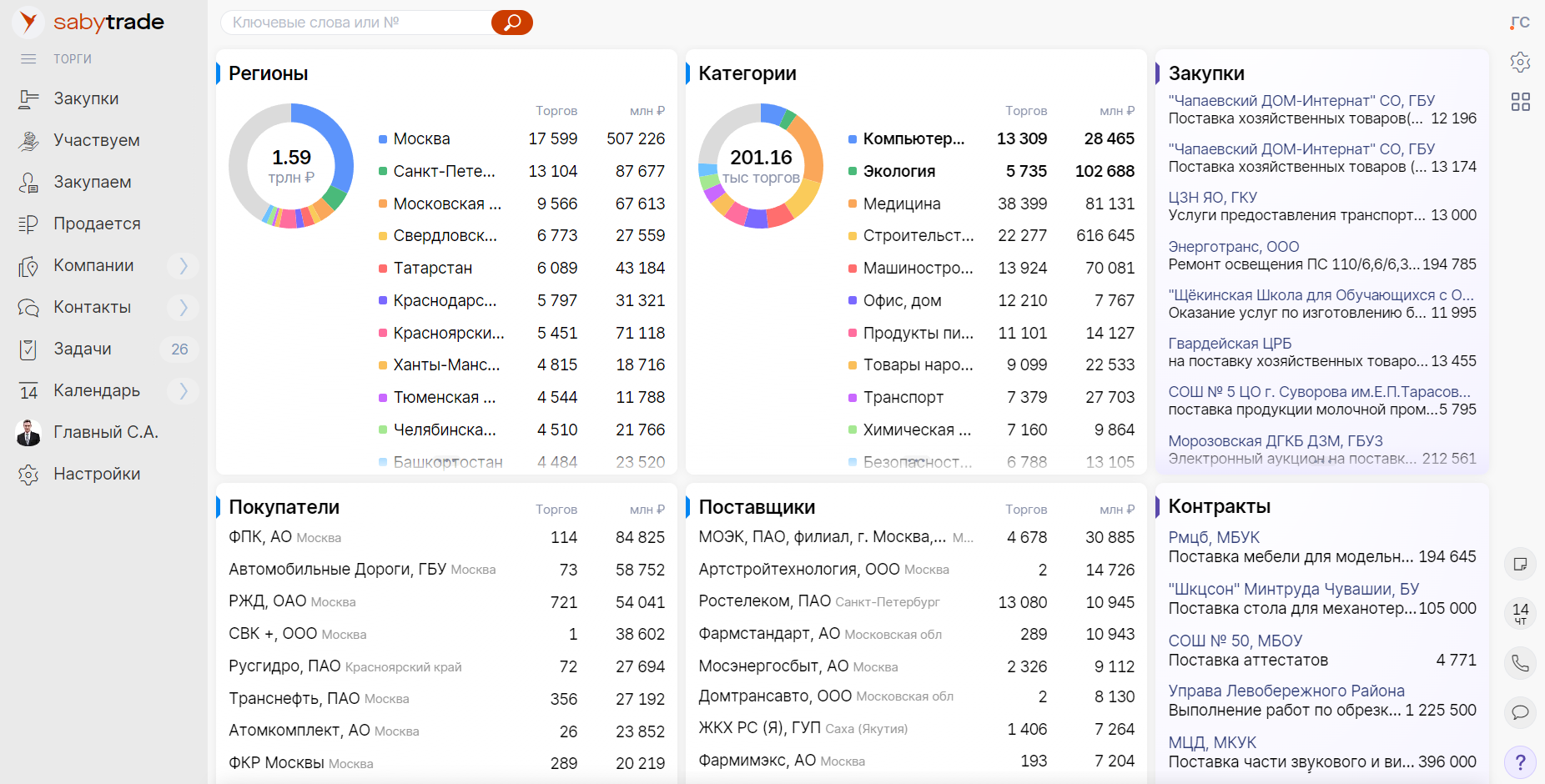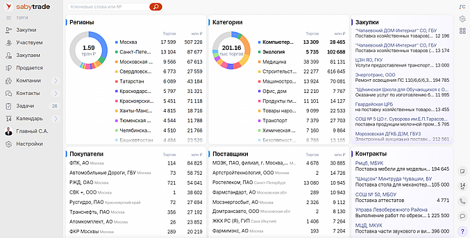 Переходите в Saby Trade,чтобы работать с торгами и закупками, не отвлекаясь на лишнее. На стартовой странице — все для легкого поиска: топ торгов по регионам, категориям, покупателям, поставщикам и площадкам, а также информация о новых закупках, контрактах и жалобах. Мы уже разместили все в удобных виджетах на рабочем столе, но вы можете легко изменить его под себя.