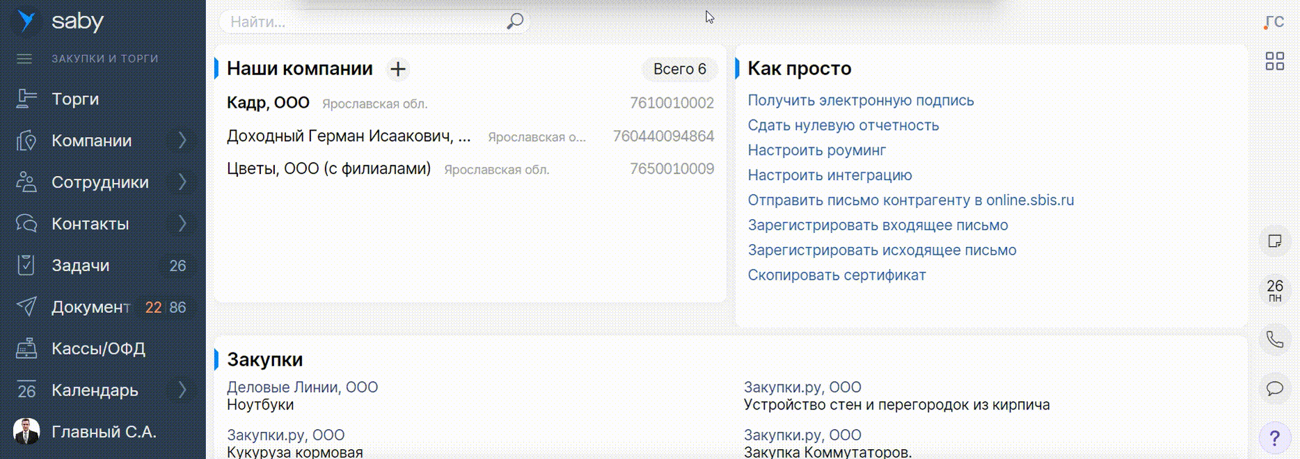 Зайдите на trade.saby.ru или перейдите в приложение, кликнув на инициалы. Чтобы попадать в приложение быстрее, создайте ярлык на рабочем столе. СБИС и Saby работают на едином пространстве данных. Ничего переносить не нужно. Все, что вы сделаете в Saby Trade, сохранится и на online.saby.ru. И наоборот. Вы сможете переключаться и работать там, где вам удобнее.
