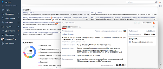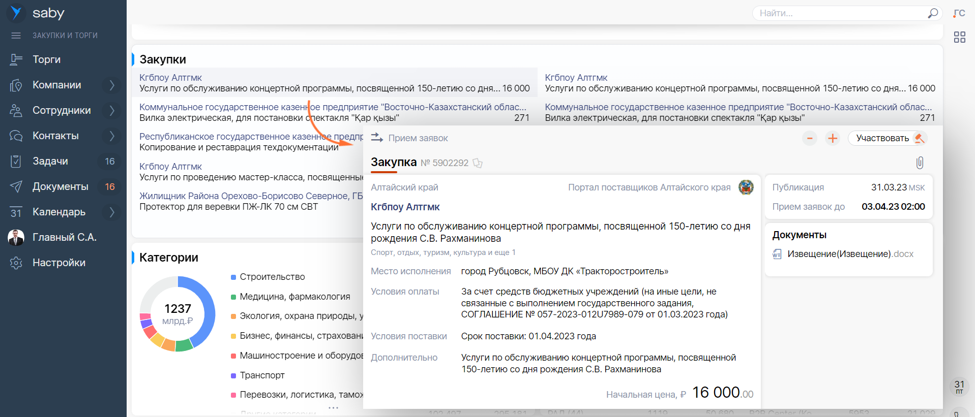 Нажмите на название виджета, и СБИС перекинет вас на нужный раздел с детализацией. Если кликнуть на определенный тендер из списка, система покажет всю информацию о нем.